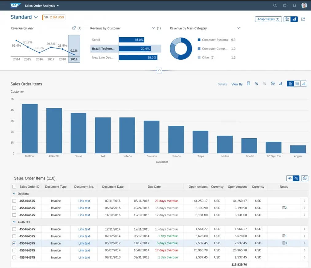 The List Report template is ideal for displaying a large set of items, enabling users to perform actions and locate data using filtering, searching, and sorting options. It provides a filter bar for searching and filtering, as well as a table to display the list of items and charts. Possible scenarios include a list of sales orders, master data entries (such as customers or products), or purchase requisitions.