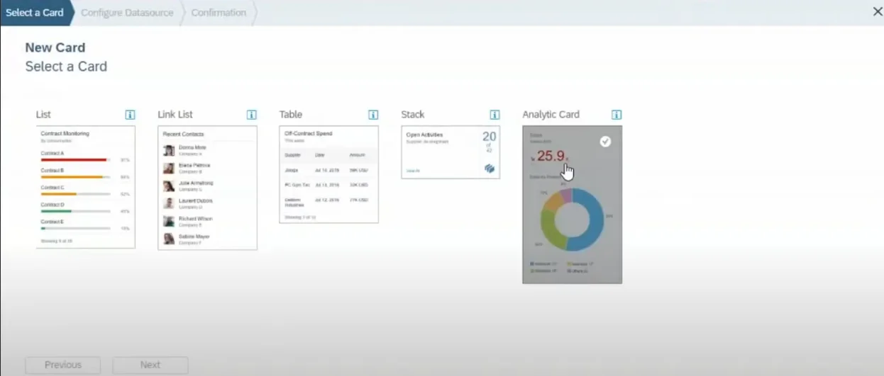 2.The New Card Wizard will open. On the “Select a Card” page, select the desired card type, such as List, Link List, Table, Stack, or Analytical Card, and then click Next.