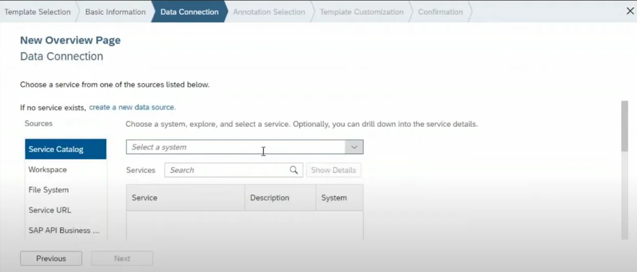 1. On the next screen of “Data Connection” -> Click on Service Catalog -> Select a server or system from the drop-down.