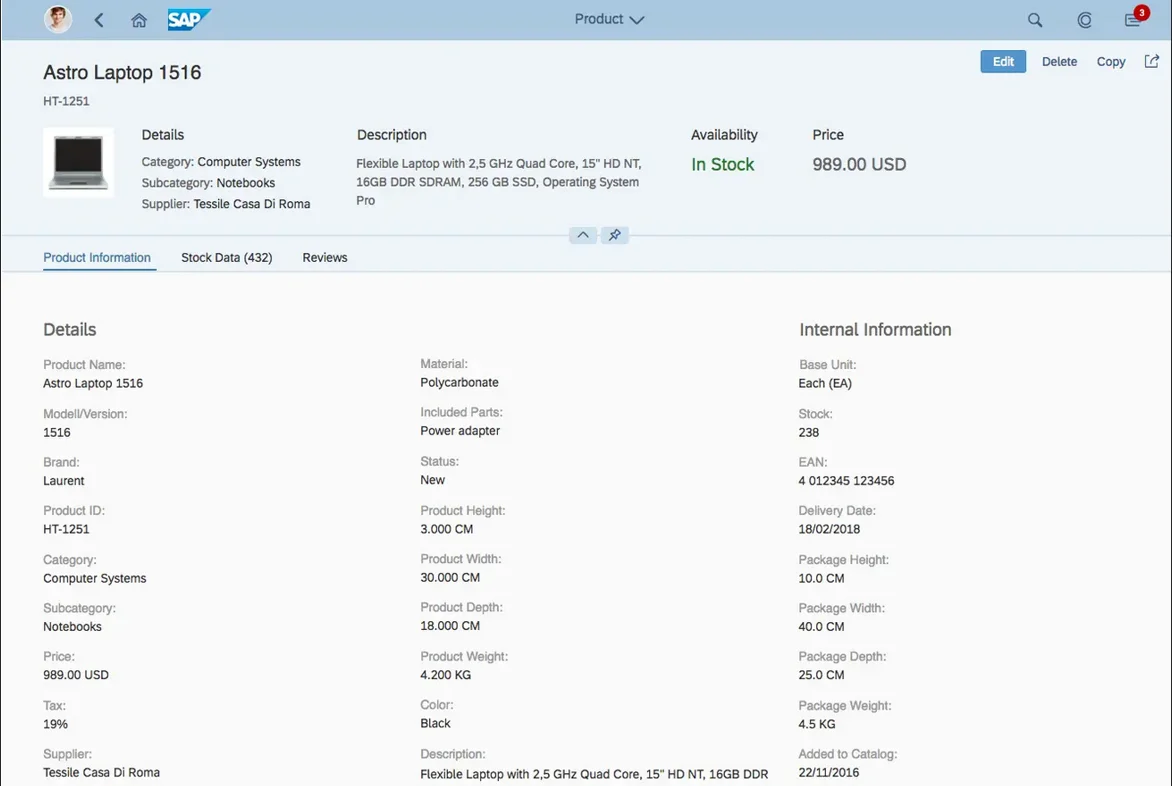 The Object Page template is used to display a detailed 360-degree view of a single business object, allowing users to view, edit, and interact with related data. It provides a header with key actions and information, featuring multiple sections that consist of collapsible groups or tabs. It presents data such as general information, attachments, addresses, or line items. Possible use cases include viewing the details of a sales order, a customer, a product, or an employee’s information.