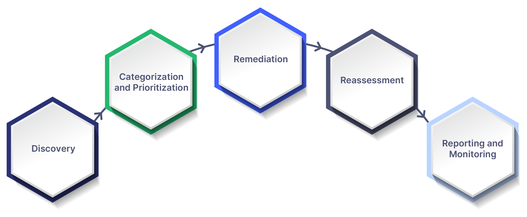 The vulnerability management lifecycle is an end-to-end process. It starts with discovery and is followed by prioritization and remediation. The lifecycle continues with reassessments of the assets and network before moving on to reporting and, eventually, continuous monitoring.