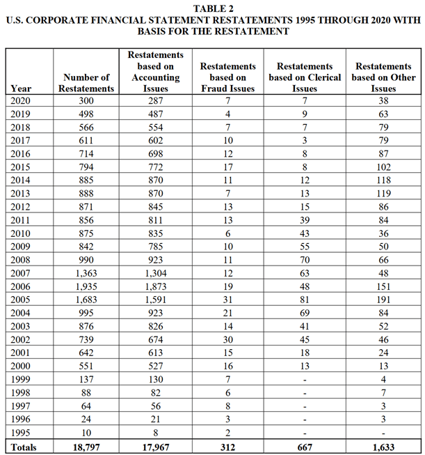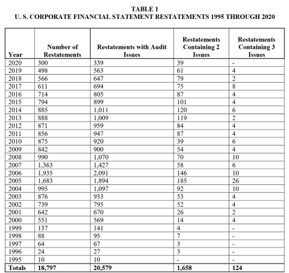 Below are two tables showing the increase and decrease in restatements from 1995 to 2020. These tables show several restatements containing several issues, their nature, etc.,