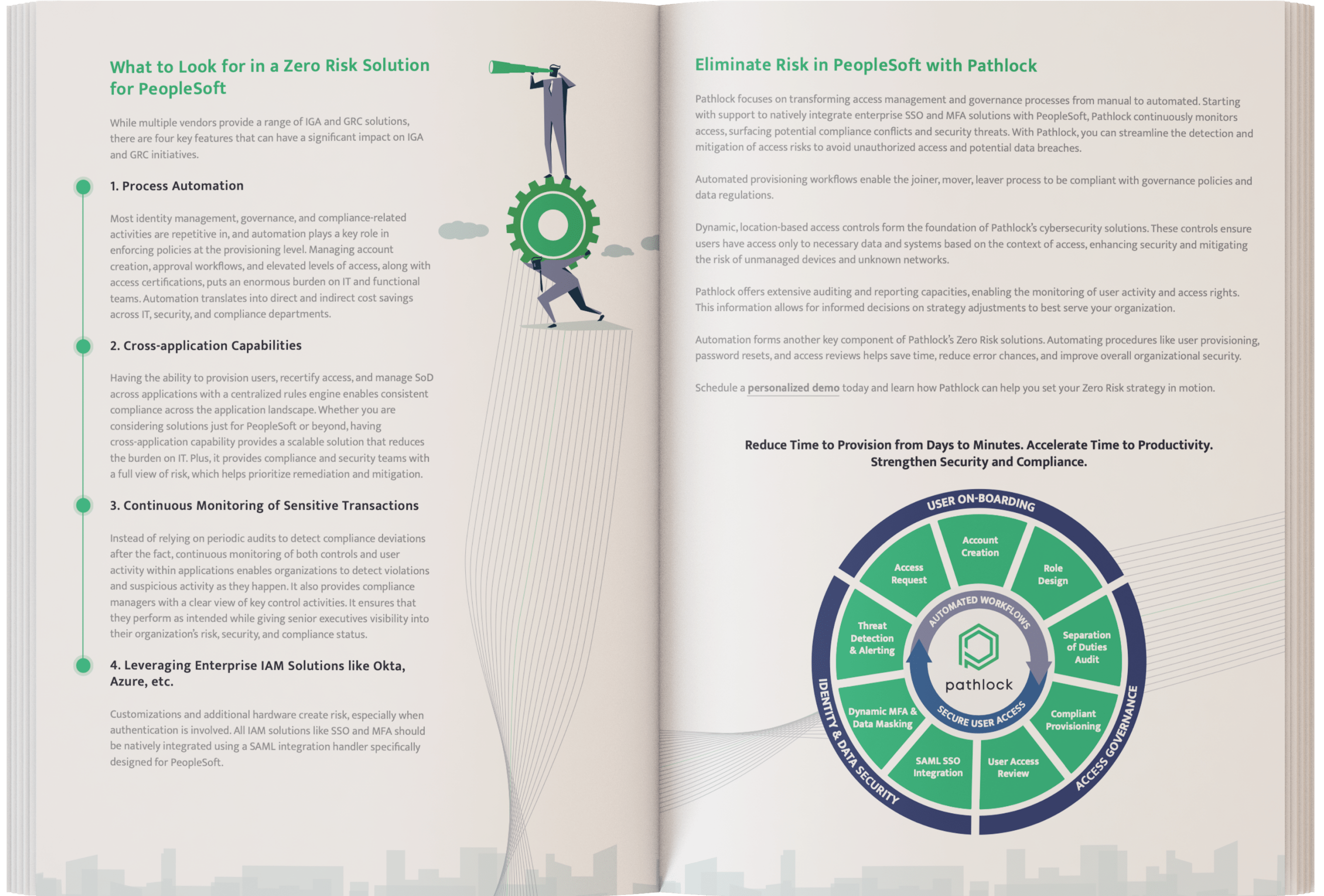 PeopleSoft applications face complex access challenges that increase security and compliance risks. This eBook explains how Pathlock’s Zero Risk approach converges IAM, IGA, and GRC into a unified solution. Automate identity lifecycle management, strengthen authentication with SSO and MFA, and implement continuous monitoring of sensitive transactions to eliminate internal and external threats while ensuring regulatory compliance proactively.